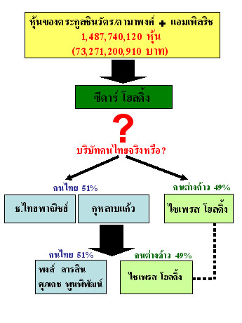 จากข้อมูลดังกล่าว ผมลองทำแผนภูมิมาให้ดูกันเล่นๆเพื่อจะได้เข้าใจในความสลับซับซ้อนของวิธีการ จัดทำโครงสร้างของการถือหุ้น เพื่อให้คงไว้ซึ่งความเป็นบริษัทไทยตามกฎหมายกำหนด แต่ยังรักษาความเบ็ดเสร็จของการบริหารให้อยู่ในมือของคนต่างด้าว