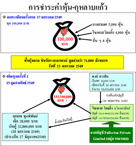 ปรากฏข้อมูลอย่างนี้ครับ คุณพงส์ ท่านจ่ายค่าหุ้นเป็นเงินสด 30,000 บาท ส่วนที่เหลือท่านจ่ายเป็นเช็ค ลงวันที่ 20 มกราคม 2549 จำนวนเงิน 50,933,000 บาท เช็คนี้จ่ายให้บริษัทไซเพรส โฮลดิ้ง เมื่อวันที่ 29 พฤษภาคม ความจริงต้องจ่ายให้ กุหลาบแก้ว แต่เพราะไซเปรสออกเงินค่าหุ้นล่วงหน้าไปก่อน คุณพงส์ท่านจึงเขียนเช็คจ่ายคืน เช็คดังกล่าวมีการตัดบัญชีเมื่อวันที่ 29 พฤษภาคม 5 เดือนให้หลัง ไม่น่าเชื่อใช่ไหมครับ