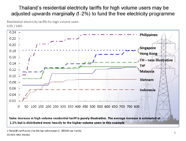 ดูกร๊าฟด้านบนให้เข้าใจง่ายคือเส้นแนวนอนสีเขียวของไทยมีการปรับระดับสูงขึ้นช่วง 150 kwh และปรับอีกเล็กน้อยช่วง 400 kwh  จาก 420-800 kwh เป็นเส้นตรงแนวนอน     ส่วน ฮ่องกง สิงค์โปร์ ปรับหลายขยัก   มาเลย์ปรับหลายขยักแต่เริ่มต้นค่าไฟถูกกว่าบ้านเรา   กร๊าฟนี้คือคำตอบว่าผู้ใช้ไฟฟ้ามากที่สุดของบ้านเรายังจ่ายค่าไฟฟ้าในอัตราที่อาจไม่เป็นธรรมกับผู้ใช้ไฟฟ้าน้อย